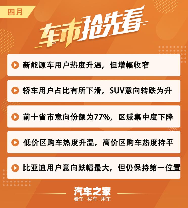 ■ 分車型級別走勢:轎車用戶占比有所下滑,SUV意向轉跌為升 4月,新能源車中轎車、SUV、MPV用戶購車意向占比分別為62.2%、36.2%、1.7%。轎車用戶意向占比相較上月下降0.6個百分點,份額開始回落。SUV用戶意向占比開始轉跌為升,環比增加0.8個百分點。MPV用戶意向占比4月環比降低0.2個百分點,意向占比仍較低。 ■ 分區域走勢:前十省市意向份額為77%,市場區域集中度下降 今年4月,用戶購車意向占比最高的5個省份包括廣東、北京、上海、浙江、河南,廣東以16.0%的意向占比獨居鰲頭。用戶購車意向TOP 10省份意向份額累計達77.0%,相較上月降低1個百分點,市場區域集中度有所下降。 上述10個省份中,用戶意向占比有所增長的有9個,其中廣東用戶意向增加0.5%,蟬聯意向占比增長較高的省份,這可能與當地政府發布了一系列支持政策有關。僅北京一個省份下滑,下滑幅度為4.2%。 了解了用戶購車意向的省份分布,我們再來看一下城市格局。今年4月,非限購城市的用戶意向占比達50.4%,仍居市場主力。用戶購車意向占比最高的5個城市包括北京、上海、深圳、廣州、天津,北京以15.7%的意向占比榮登榜首,大幅甩開其他城市。 TOP10城市用戶意向占比累計達56.2%,相較上月降低1.4個百分點,市場城市集中度有所下降。上述10個城市中,除北京外,其他所有城市用戶意向占比都有所增長(或持平),體現市場向好發展。 ■ 分價區走勢:低價區購車熱度升溫,高價區購車熱度基本持平 價格是用戶購車時最主要的考慮因素之一,那么用戶對不同價位車型的意向度究竟如何?今年4月,12萬以下價區用戶購車意向占比為25.1%,相較上月增加2.1個百分點;12-20萬價區用戶購車意向占比達32.2%,對比上月下滑2.7%;20-30萬價區用戶意向占比為21.1%,相較上月上漲1%個百分點;30-50萬價區用戶意向占比為12.9%,比上月降低0.4個百分點;50萬以上價區用戶意向占比為8.6%,較上月保持穩定不變。 通過分析近12個月的用戶意向數據發現,2019年5月至今年4月,12萬以下價區用戶意向占比增加2個百分點,低價市場熱度有所升溫;12-20萬價區用戶意向占比上漲5%,市場熱度保持較大幅度增長;20萬以上價區用戶意向占比,下跌7.1個百分點,其中,20-30萬價區市場熱度下滑明顯,近12個月線索占比下跌11.1%。未來,隨著新能源車型的布局更全面,市場將進一步細分,價區覆蓋也會更加均勻。 ■ 分廠商走勢:比亞迪用戶意向跌幅最大,但仍保持榜首 在日趨激烈的市場競爭中,各車企對于用戶的爭奪也是愈演愈烈??v觀4月市場,TOP 10廠商用戶購車意向占比累計達54.8%,相較上月份額增加0.7個百分點,市場集中度進一步提升。十個廠商中,有6個廠商用戶意向占比實現上漲,份額增幅最大的廠商為長城汽車,以1.8%的增幅領漲TOP 10廠商;跌幅最大的廠商為比亞迪,下降比例為1.6%,不過依然霸占市場榜首位置。 ■ 用戶意向偏好:女神更愛轎車,男神更愛大車 不同特征的用戶,其汽車消費偏好存在一定差異,那么性別的差異會對用戶意向帶來哪些變化,一起來看一下。通過分析用戶意向數據,可以看到,女性用戶比男性用戶,對于轎車的偏好更強,在4月女性用戶來源的購車意向數據中,轎車占比為69.2%,比男性轎車購車意向占比高8.0個百分點。相反,男性用戶更偏好空間大、外形硬朗的車型,男性SUV購車意向占比比女性高8.2個百分點。與上月相比,女性用戶來源的SUV、MPV購車意向占比有所下滑,而轎車購車意向占比存在一定上漲;男性用戶來源的轎車、MPV購車意向占比下跌,而SUV意向份額有所增加。 對于新能源車,愛車的男神、女神到底誰最愛一擲千金?今年4月,男性在12萬以下價區的購車意向占比為25.6%,而女性為33.7%,在低價區中男性份額比女性低8.1個百分點。在12-20萬價區中,女性購車意向占比相較男性,低5.5%。在20萬以上價區,女性購車意向占比,比男性低2.6個百分點,但女性相較其上月購車意向占比實現了增長,在50萬以上價區,女性比男性分別高2.1%。 ■ 總結 整體來看,4月新能源車市正在進一步復蘇,其中消費者對于中國品牌的熱度還在升溫,意向占比增加了1.4個百分點,達到63.3%。特斯拉在降價熱度過去后,整體熱度也有所下滑。不過今年5月1日,特斯拉又迎來新一輪降價,其5月車市熱度有望提升。未來,隨著新能源車型的增多,市場競爭會加劇,產品也會日益成熟。而作為消費者,你會選擇新能源嗎?(文/汽車之家 數說行業) |